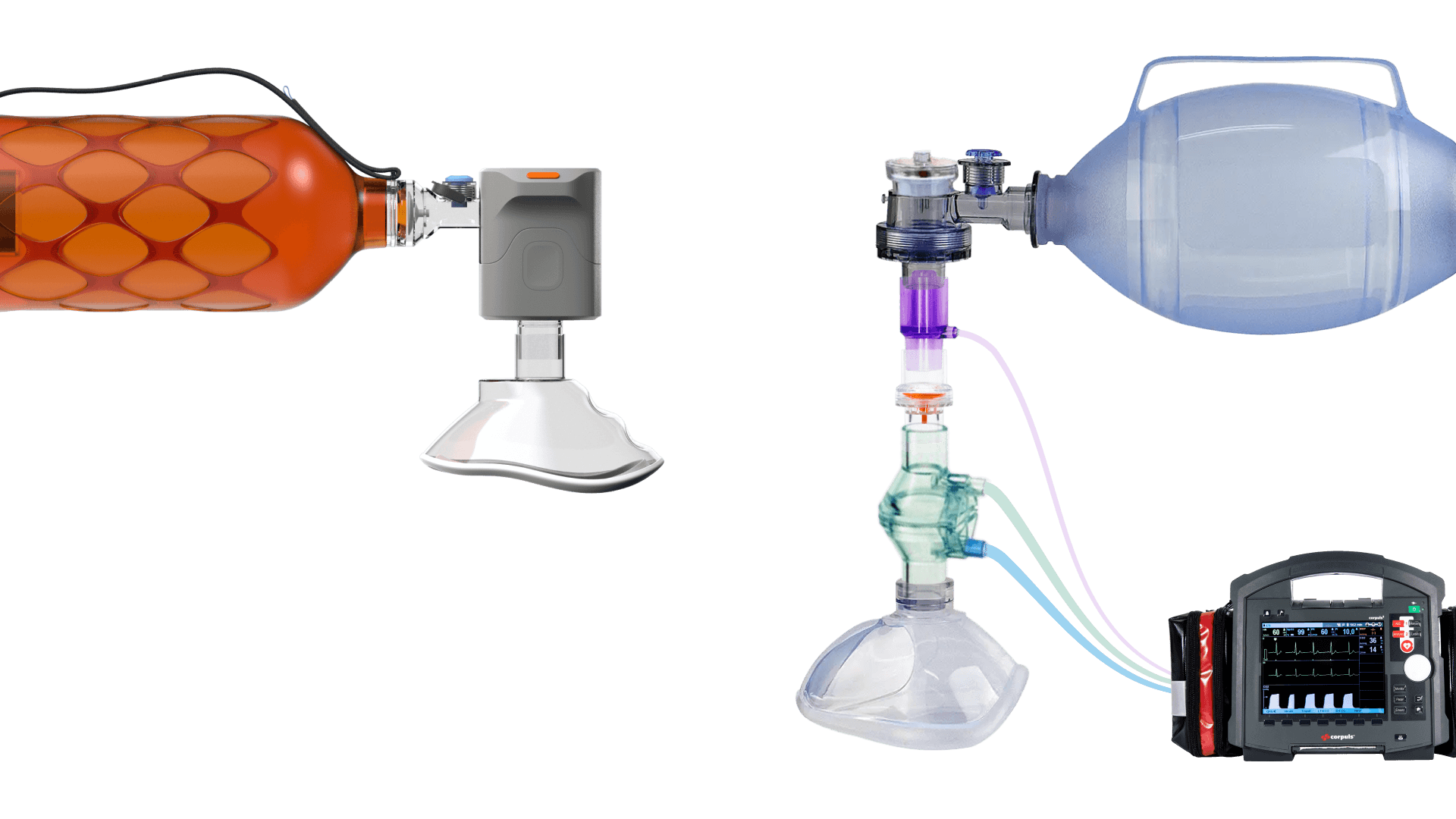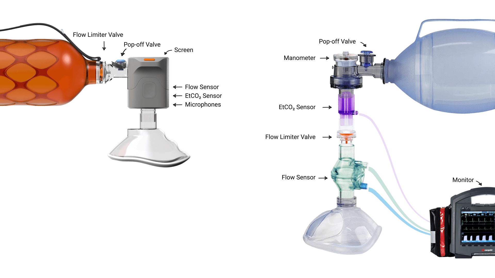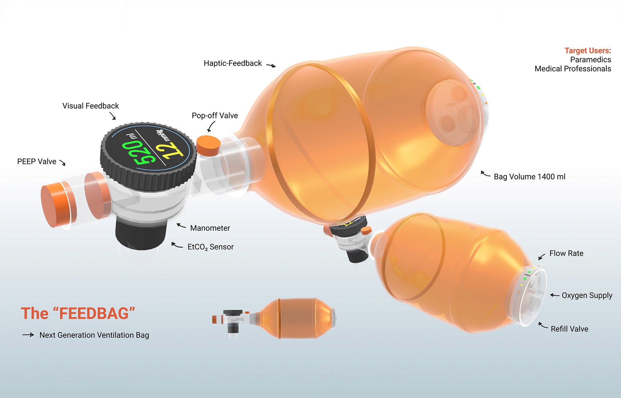 Todays ventilation bags require stacking separate sensors and valves into a clunky tower, to get us much feedback as possible. On top of that forcing users to look away at distant monitors instead of keeping their eyes on the patient. This akward setup leads to paramedics avoiding to you these sensors.