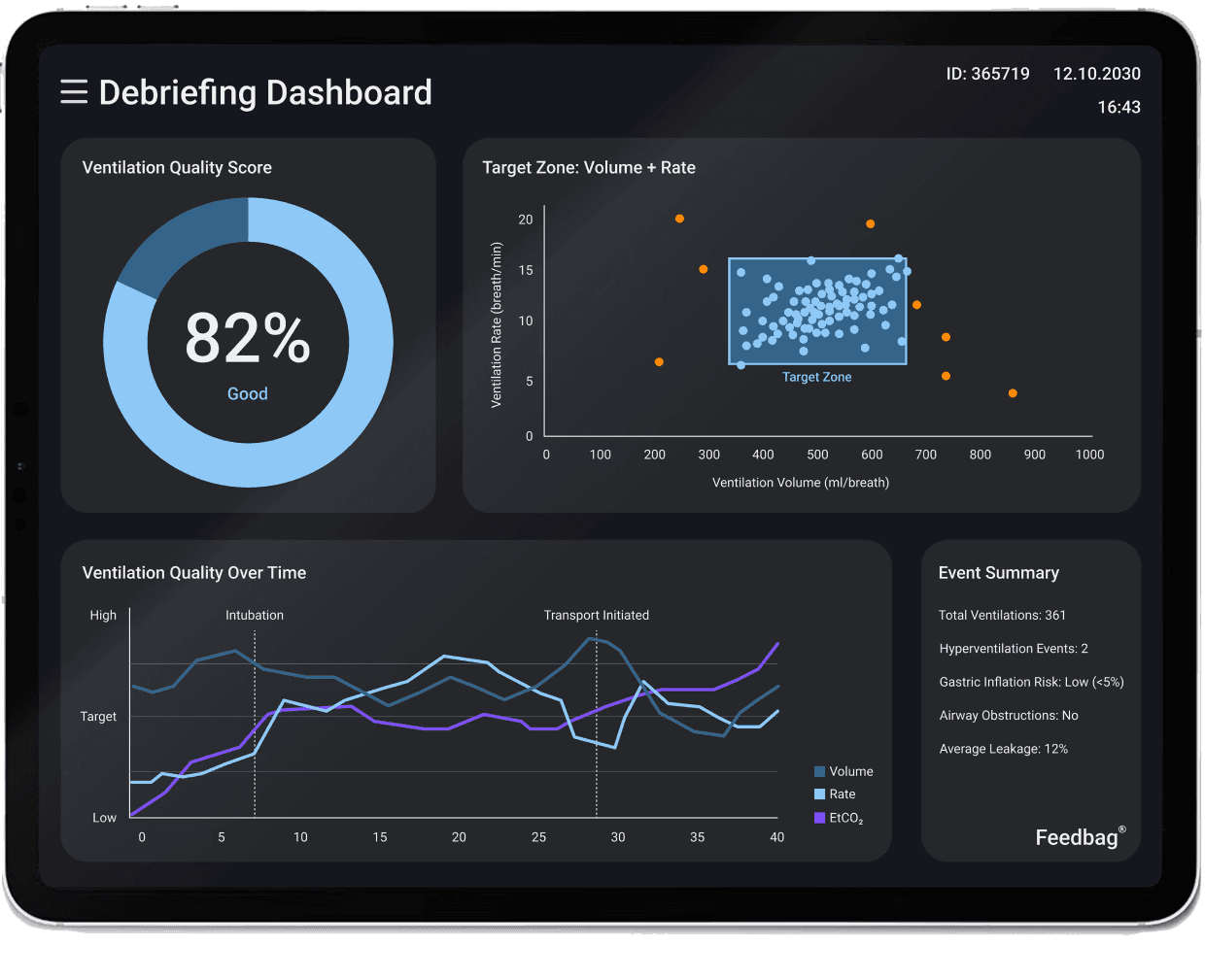 Beyond real-time guidance, the system captures vital performance data for comprehensive debriefing. The analysis screen visualizes overall ventilation quality by tracking accurate rate and volume delivery throughout the entire resuscitation. By turning stressful emergency data into clear actionable graphs, it empowers teams to review their execution and refine their skills for the future.